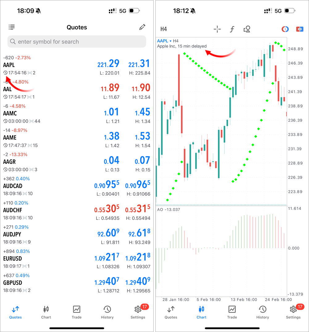 - 如果交易工具使用了延迟,则改进报价延迟指示。此信息现在显示在图表上,同时“市场报价”部分的图标变得更加突出。